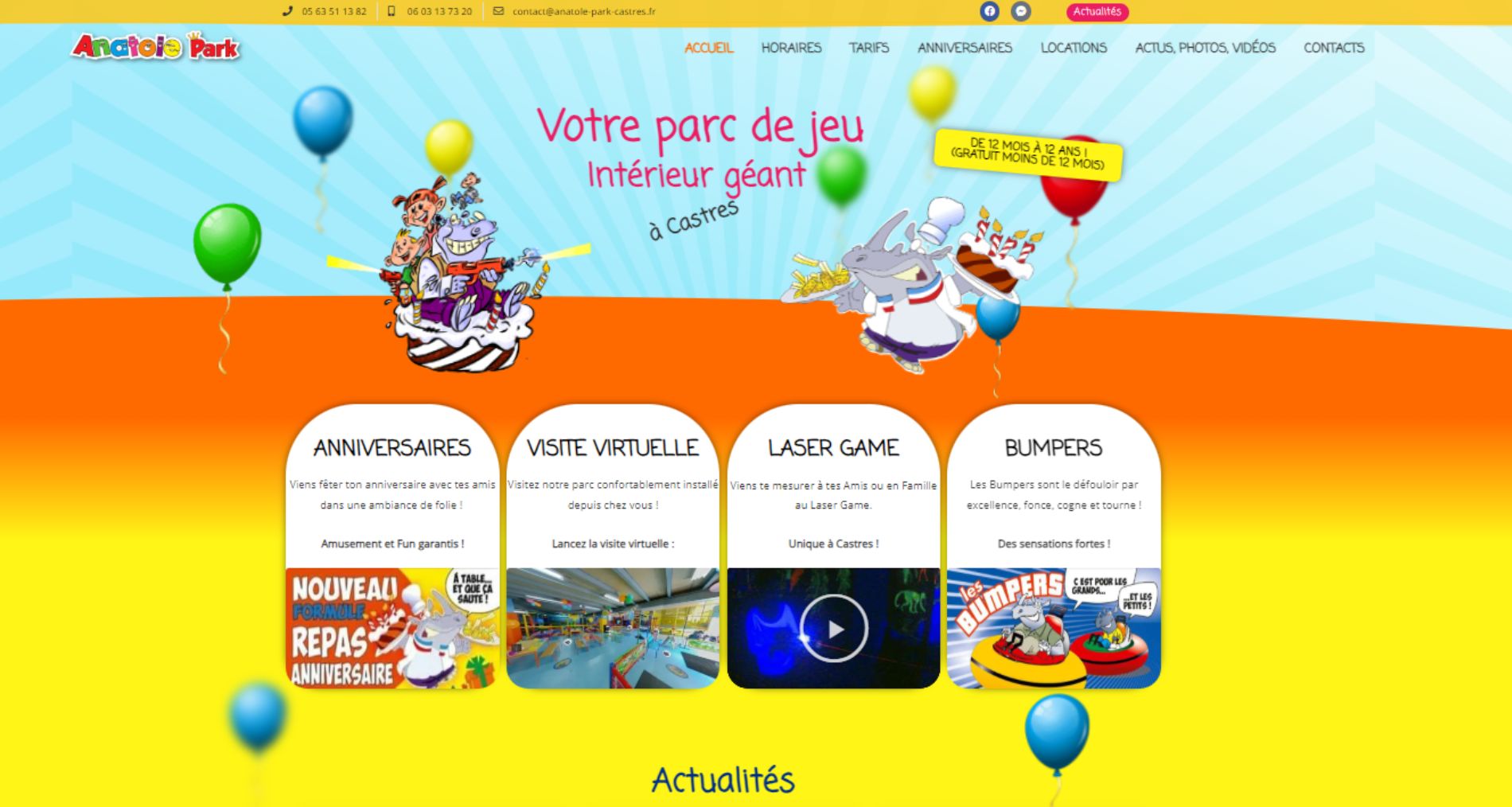 Nous avons été contactés pour concevoir le site internet de Anatole Park Castres, un parc de jeux intérieur géant dédié aux enfants et aux familles. L’objectif était de créer un site à la fois fun et agréable, en accord avec l’univers du parc, tout en mettant en avant l’ensemble des prestations proposées.