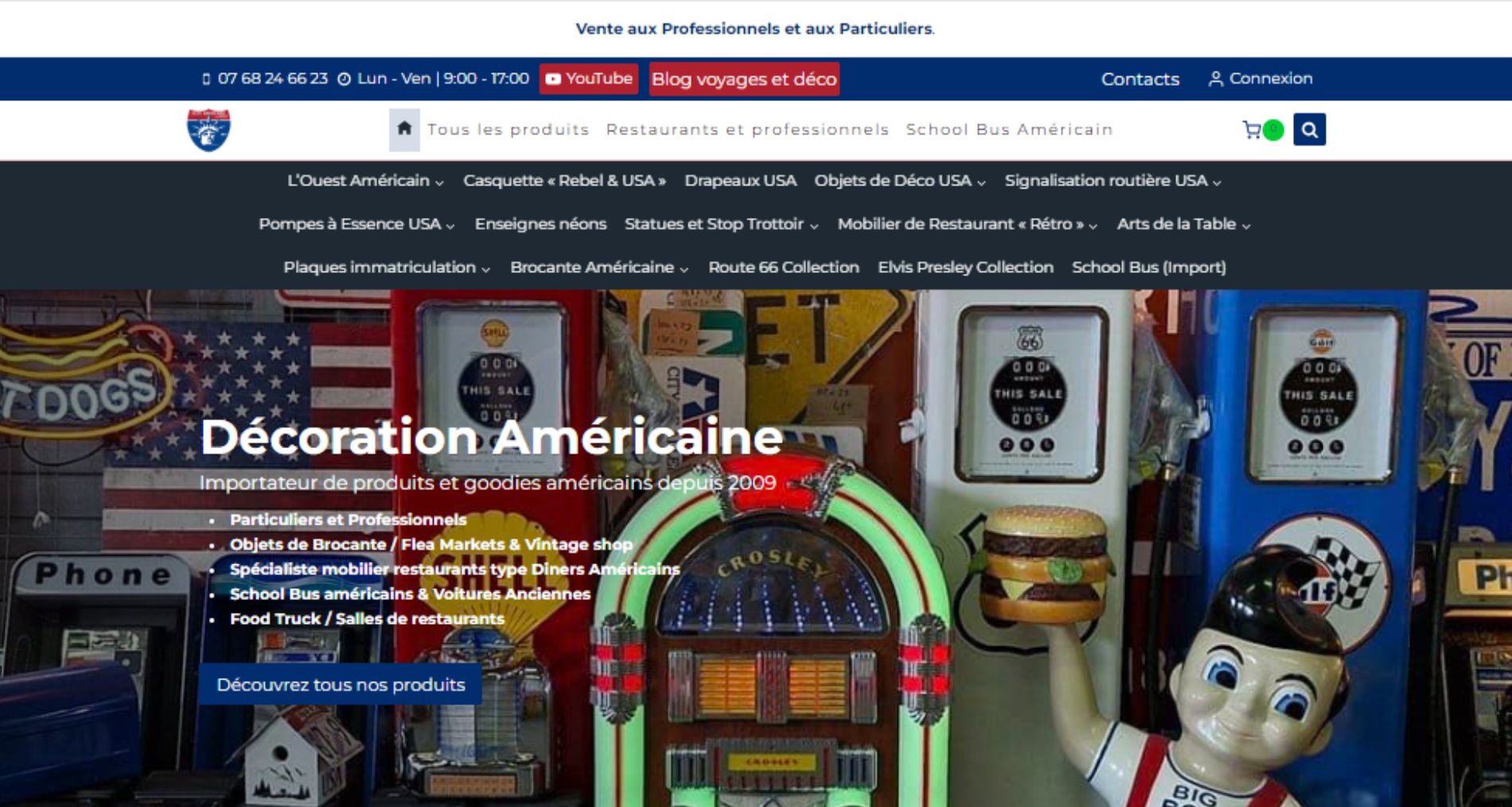 Nous avons été sollicités pour la création du site internet de Déco Américaine, un spécialiste de l’importation de produits et objets vintages américains. L’objectif était de développer une plateforme e-commerce capable de mettre en avant une large gamme de produits : mobilier de restaurants type diner, plaques d’immatriculation, pompes à essence, school bus américains, et bien plus encore.
