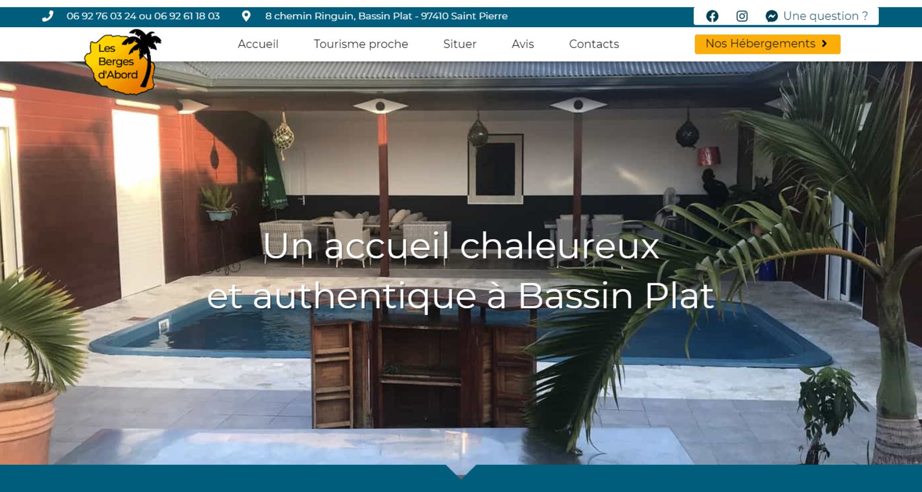 Nous avons été sollicités pour concevoir le site internet de Les Berges d’Abord, un établissement de location saisonnière situé à Saint-Pierre, sur l’Île de la Réunion. L’objectif principal était de créer un site clair, attrayant et fluide, permettant aux visiteurs de découvrir les hébergements disponibles, les équipements et les services proposés.