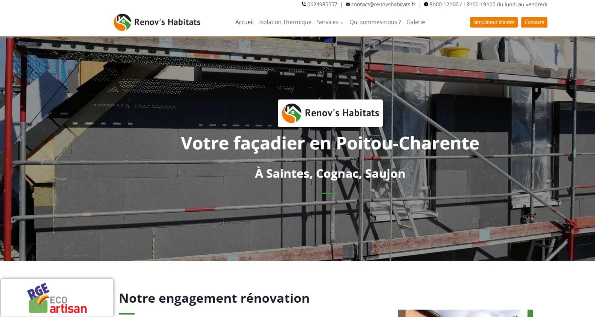 Rénov’s Habitats, expert en isolation thermique par l’extérieur, nous a confié la création de son site vitrine professionnel. Située en Charente-Maritime, l’entreprise accompagne ses clients dans leurs projets de rénovation énergétique en proposant des solutions sur mesure, alliant performance et esthétique.