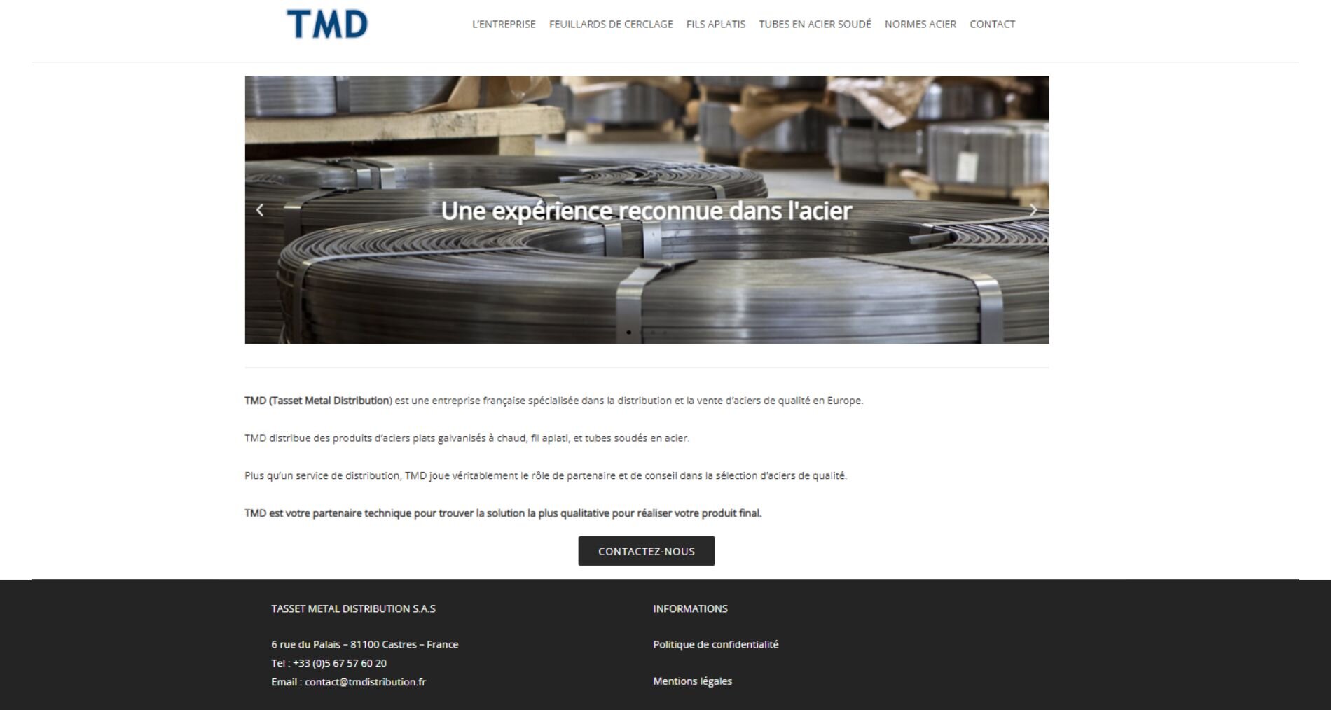 Le site internet sert principalement de carte de visite en ligne, permettant aux clients potentiels de découvrir l’activité de TM Distribution et d’entrer en contact directement par téléphone ou mail via les informations affichées.